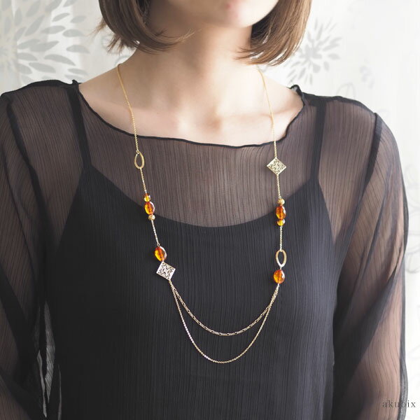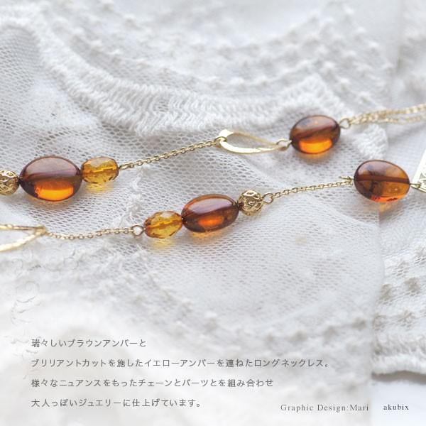 瑞々しいブラウンアンバーと ブリリアントカットを施したイエローアンバーを連ねたロングネックレス。